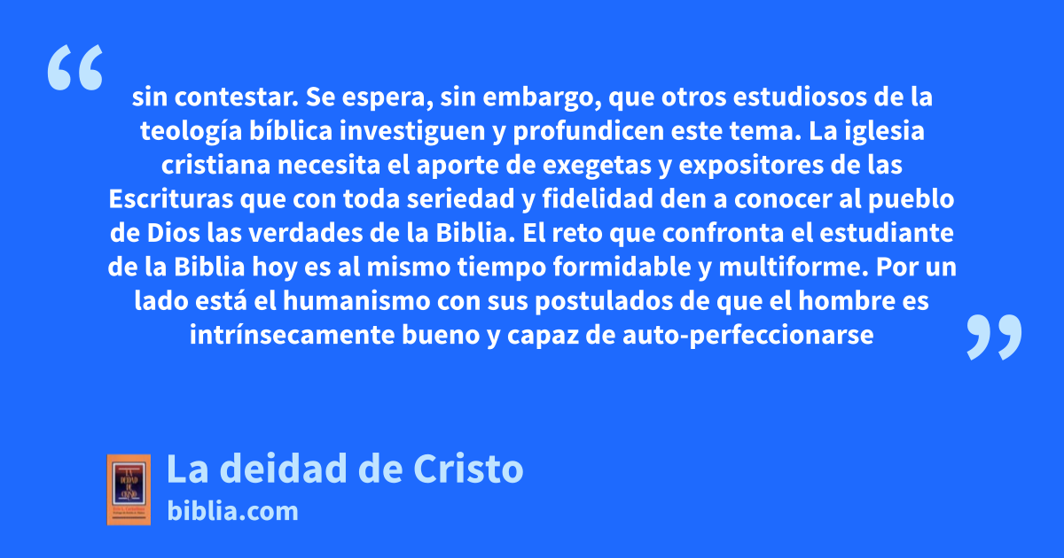 sin contestar. Se espera, sin embargo, que otros estudiosos de la teología bíblica investiguen y profundicen este tema. La iglesia cristiana necesita el aporte de exegetas y expositores de las Escrituras que con toda seriedad y fidelidad den a conocer al pueblo de Dios las verdades de la Biblia. El reto que confronta el estudiante de la Biblia hoy es al mismo tiempo formidable y multiforme. Por un lado está el humanismo con sus postulados de que el hombre es intrínsecamente bueno y capaz de auto-perfeccionarse