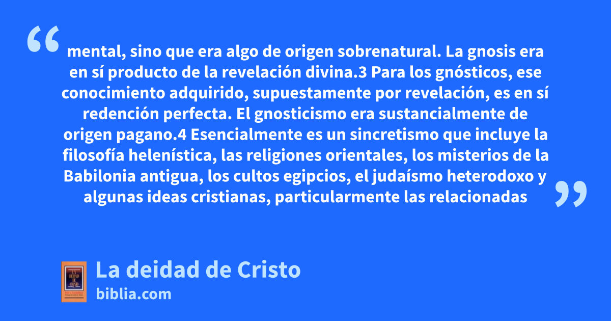 mental, sino que era algo de origen sobrenatural. La gnosis era en sí producto de la revelación divina.3 Para los gnósticos, ese conocimiento adquirido, supuestamente por revelación, es en sí redención perfecta. El gnosticismo era sustancialmente de origen pagano.4 Esencialmente es un sincretismo que incluye la filosofía helenística, las religiones orientales, los misterios de la Babilonia antigua, los cultos egipcios, el judaísmo heterodoxo y algunas ideas cristianas, particularmente las relacionadas