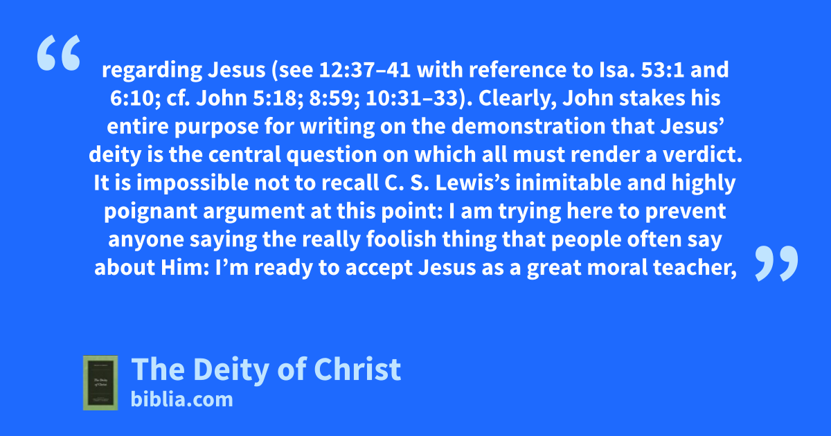 regarding Jesus (see 12:37–41 with reference to Isa. 53:1 and 6:10; cf. John 5:18; 8:59; 10:31–33). Clearly, John stakes his entire purpose for writing on the demonstration that Jesus’ deity is the central question on which all must render a verdict. It is impossible not to recall C. S. Lewis’s inimitable and highly poignant argument at this point: I am trying here to prevent anyone saying the really foolish thing that people often say about Him: I’m ready to accept Jesus as a great moral teacher,