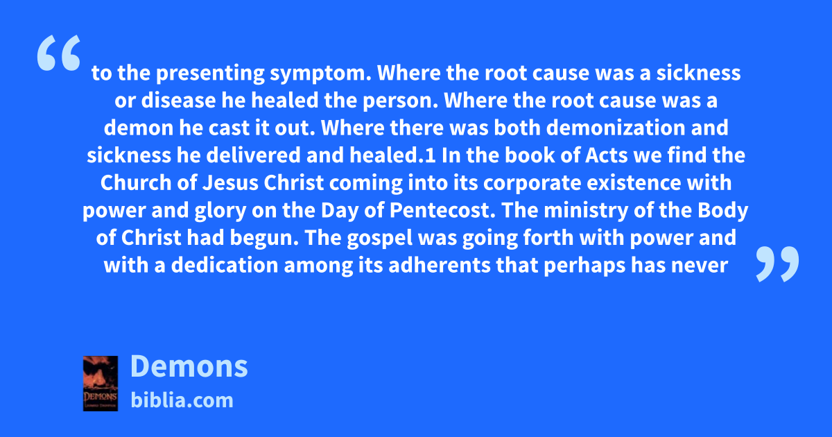 to the presenting symptom. Where the root cause was a sickness or disease he healed the person. Where the root cause was a demon he cast it out. Where there was both demonization and sickness he delivered and healed.1 In the book of Acts we find the Church of Jesus Christ coming into its corporate existence with power and glory on the Day of Pentecost. The ministry of the Body of Christ had begun. The gospel was going forth with power and with a dedication among its adherents that perhaps has never