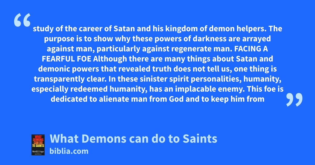 study of the career of Satan and his kingdom of demon helpers. The purpose is to show why these powers of darkness are arrayed against man, particularly against regenerate man. FACING A FEARFUL FOE Although there are many things about Satan and demonic powers that revealed truth does not tell us, one thing is transparently clear. In these sinister spirit personalities, humanity, especially redeemed humanity, has an implacable enemy. This foe is dedicated to alienate man from God and to keep him from