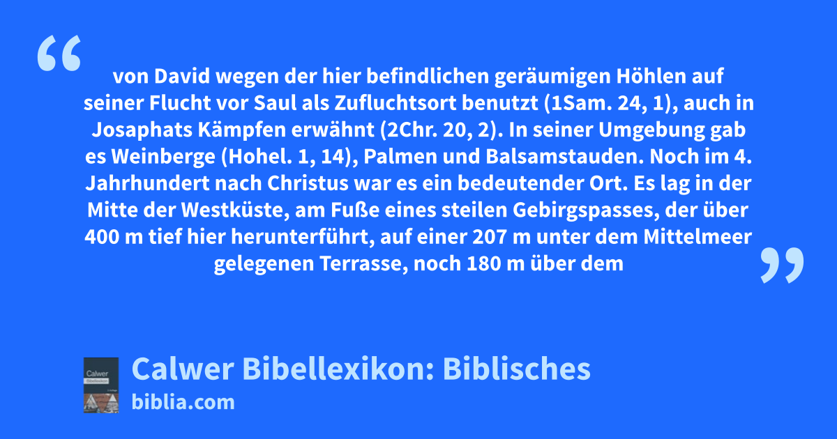 Engedi (Bocksquelle), nach 2Chr. 20, 2 gleich Hazezon-Thamar (= Palmen-Fällen, 1Mos. 14, 7), später im Besitz des Stammes Juda (Jos. 15, 62), von David wegen der hier befindlichen geräumigen Höhlen auf seiner Flucht vor Saul als Zufluchtsort benutzt (1Sam. 24, 1), auch in Josaphats Kämpfen erwähnt (2Chr. 20, 2). In seiner Umgebung gab es Weinberge (Hohel. 1, 14), Palmen und Balsamstauden.