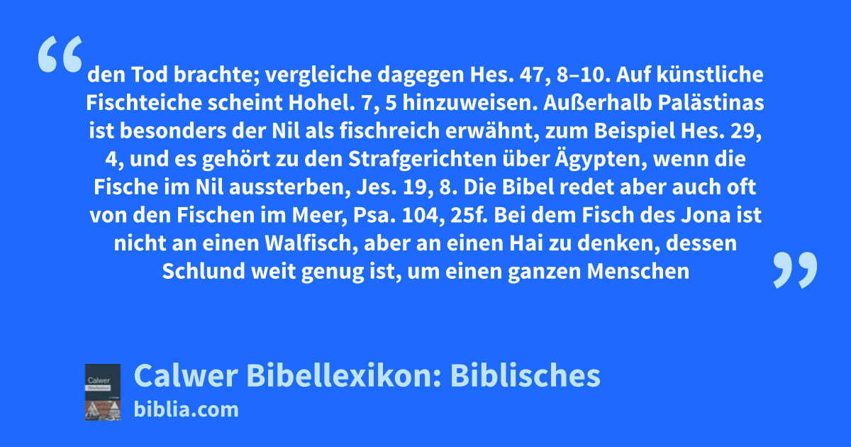 Fische (das hebräische Wort deutet auf die rasche Vermehrung hin) kommen in der Bibel oft vor, aber ohne dass einzelne Arten näher bezeichnet würden. Sie waren eine häufige Speise, es durften jedoch nur die Wassertiere, welche Schuppen und Flossen haben, nach dem Gesetz (3Mos. 11, 9ff) genossen werden, wogegen zum Beispiel die Aale unrein waren. In Ägypten hatten sich die Israeliten den Genuss der Fische als einer wohlfeilen Nahrung angewöhnt, vergleiche 4Mos. 11, 5 (das „umsonst“ wird nur eben dies bezeichnen). Das Fischtor zu Jerusalem deutet wohl auf einen Fischmarkt in der Nähe (Neh. 3, 3, vergleiche Neh. 13, 16). Im Neuen Testament sehen wir Fischer in der nächsten Umgebung Christi, Fischnahrung kommt öfter vor, Joh. 6, 9; Matth. 7, 10; Matth. 14, 17; Matth. 17, 27 und so weiter, und Christus verwendet die Fische in seinen Gleichnissen, Matth. 13, 47ff. („Faul“ heißen die jüdischen Fischer einen schuppenlosen Fisch, wie den Clarias macracanthus, Abbildung 117, 1, an den wohl auch bei der „Schlange“ Matth. 7, 10 zu denken ist.)