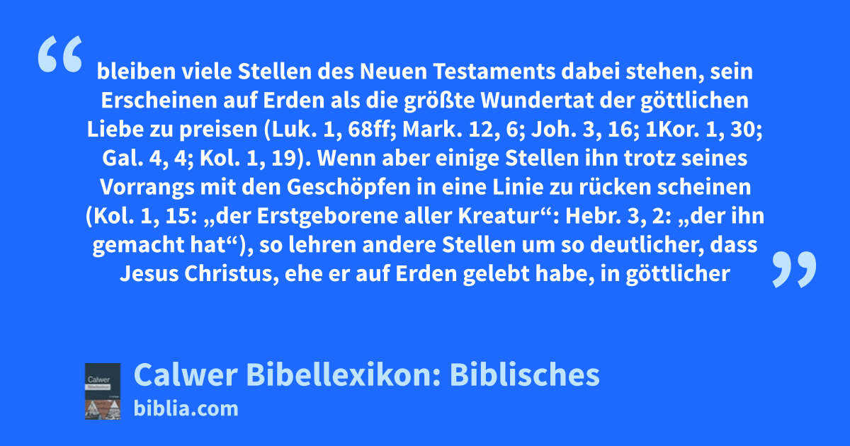 Was endlich den Ursprung Jesu in seiner Beziehung zu Gott betrifft, so bleiben viele Stellen des Neuen Testaments dabei stehen, sein Erscheinen auf Erden als die größte Wundertat der göttlichen Liebe zu preisen (Luk. 1, 68ff; Mark. 12, 6; Joh. 3, 16; 1Kor. 1, 30; Gal. 4, 4; Kol. 1, 19). Wenn aber einige Stellen ihn trotz seines Vorrangs mit den Geschöpfen in eine Linie zu rücken scheinen (Kol. 1, 15: „der Erstgeborene aller Kreatur“: Hebr. 3, 2: „der ihn gemacht hat“), so lehren andere Stellen um so deutlicher, dass Jesus Christus, ehe er auf Erden gelebt habe, in göttlicher Gestalt im Himmel beim Vater gewesen sei und in seinem Herabkommen auf die Erde den ersten Beweis seiner selbstlosen Liebe zu uns geliefert habe (Phil. 2, 5–8; 2Kor. 8, 9); ja dass derjenige, durch welchen Gott in der Fülle der Zeiten sein Reich auf Erden gegründet, schon am Anfang es gewesen sei, durch welchen alle Dinge geschaffen worden sind (1Kor. 8, 6; Kol. 1, 16; Hebr. 1, 2). Vergleiche Artikel Jesus Christus und Objekt. Johannes insbesondere hat - anknüpfend an ein gewiß aus treuer Erinnerung stammendes Rätselwort Christi selbst: „Ehe denn Abraham wurde, bin ich“ (Joh. 8, 58) - es zur Grundlage seines ganzen Evangeliums gemacht, dass Christus aus dem Himmel und aus der Ewigkeit in diese Welt gekommen, und nachher wieder dorthin zurückgekehrt sei (Joh. 16, 27f und oft). Und im Eingang seines Evangeliums (Joh. 1, 1–18) nennt er ihn, anklingend nicht nur an alttestamentliche Stellen von der vorweltlichen Weisheit Gottes (Spr. 8 und sonst), sondern auch an den Sprachgebrauch des alexandrinischen Philosophen Philo, das Wort, den Logos, den uranfänglichen Vermittler aller göttlichen Offenbarung, alles Lichts und Lebens für die Menschen, der selbst göttlicher Natur war, aber in Jesus Christus Fleisch geworden ist. Übrigens braucht das Neue Testament nirgends den Ausdruck „Zeugung“ für das Hervorgehen des Sohnes aus dem Vater (die alttestamentliche Stelle Psa. 2, 7 ist Apg. 13, 33; Hebr. 1, 5 auf die Auferstehung Jesu angewendet).