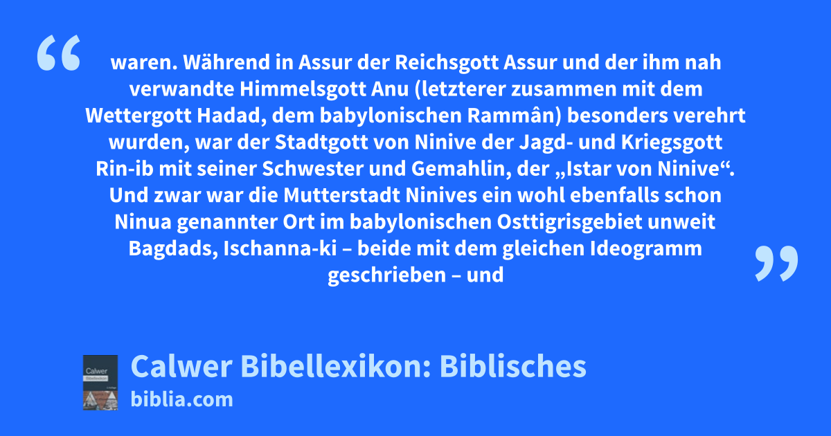 Später (so zum Beispiel Esr. 6, 22) wurde „Assur“ missbräuchlich für Persien gebraucht. — Die Geschichte Assyriens lässt sich jetzt bis vor die Zeit der sogenannten 1. Dynastie der Stadt Babel, also bis vor 2000 vor Christus, inschriftlich zurückverfolgen. Dabei zeigt sich, dass die biblische Angabe 1Mos. 10, 11 „aus selbigem Lande (Babylonien) zog er (der Jagdheros Nimrod, das ist der babylonische Städtegründer Gilgamis) aus nach Assur (so ist zu übersetzen) und gründete Ninive und Rechobot Jr (eine Vorstadt Ninives) und Kalach (südlich von Ninive) und Resen zwischen Ninive und Kalach“ durchaus auf guter alter Überlieferung beruht; hiebei ist das als Orakelsitz und Kultort der Istar oft in den Inschriften erwähnte, ziemlich weit nach Osten zu gelegene Arbela (Arba-ilu, „Viergöttersitz“) wohl absichtlich übergangen.