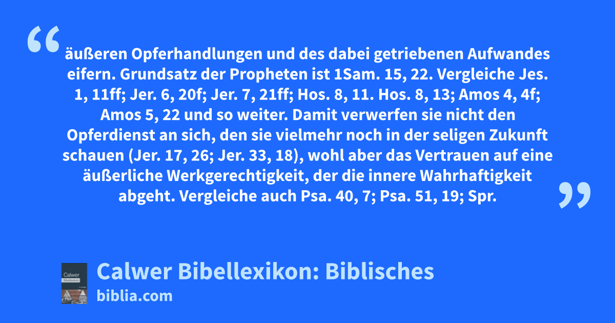 — Dieser ganze Opferkultus nun ist symbolischer Art: er drückt in seiner Äußerlichkeit nur unvollkommen innerliche Vorgänge aus. Trotz seiner Unvollkommenheit aber war er für das Volk eine vortreffliche Schule, in welcher es die höchsten Realitäten kennen lernen sollte. Aufs eindringlichste mussten ihm diese nicht leicht zu leistenden Opfer seine Abhängigkeit von Gott, die Heiligkeit des Herrn, die eigene Sündhaftigkeit, die verhängnisvollen Wirkungen der Sünde und die Notwendigkeit einer Sühnung derselben, ebenso aber auch die Freundlichkeit, Gnade und Barmherzigkeit Gottes einprägen. In diesen Zeremonien schattete sich schon das selige Geheimnis der durch Christum vollbrachten Erlösung ab. Sollten aber diese Opferhandlungen im Alten Bunde Gott gefällig sein, so musste die Gesinnung dem entsprechen, was sie äußerlich darstellten. Die Opfer sollten nichts weniger als ein bequemes Ablassinstitut sein, wo man sich Sündenvergebung durch Gaben erkaufen kannte. Ohnehin waren das Sünd- und das Schuldopfer nicht zur Sühnung von Sünden bestimmt, welche mutwillig oder boshaft, „mit erhobener Hand“, also in bewusster Auflehnung wider Gott, vorsätzlich und „aus Frevel“ (Luther) begangen worden waren (solche sollten vielmehr nach 4Mos. 15, 30 mit dem Tode bestraft werden), sondern nur von solchen, die man sich aus Verschen oder Irrtum, unter Mitwirkung verzeihlicher menschlicher Schwachheit hatte zu Schulden kommen lassen, 3Mos. 4, 2; 4Mos. 15, 27; 3Mos. 5, 15. 3Mos. 5, 17. Wo freilich die tiefere Einsicht und der sittliche Ernst, welchen diese Opfergebräuche voraussetzen, mangelten, konnten sie zu Selbstgerechtigkeit und falscher Sicherheit führen. Dass dies in Israel oft der Fall war, sehen wir aus den Schriften der Propheten, welche gegen solche der Absicht Gottes zuwiderlaufende Überschätzung der äußeren Opferhandlungen und des dabei getriebenen Aufwandes eifern. Grundsatz der Propheten ist 1Sam. 15, 22. Vergleiche Jes. 1, 11ff; Jer. 6, 20f; Jer. 7, 21ff; Hos. 8, 11. Hos. 8, 13; Amos 4, 4f; Amos 5, 22 und so weiter. Damit verwerfen sie nicht den Opferdienst an sich, den sie vielmehr noch in der seligen Zukunft schauen (Jer. 17, 26; Jer. 33, 18), wohl aber das Vertrauen auf eine äußerliche Werkgerechtigkeit, der die innere Wahrhaftigkeit abgeht. Vergleiche auch Psa. 40, 7; Psa. 51, 19; Spr. 21, 3.
