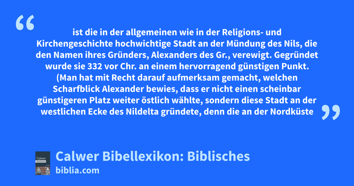 Die Stadt liegt auf einem schmalen Landstreifen, der das Meer von dem großen Landsee Mareotis trennt. Eines der Wunderbauwerke der alten Welt war der Pharus, ein riesiger, auf einer vorgelagerten kleinen Insel gebauter Leuchtturm. Berühmt war auch die überaus reiche Bibliothek von Alexandrien. Die Stadt selbst wuchs rasch zu großer Bedeutung heran. Sie hatte zu der Ptolemäer Zeiten wohl 1 Mill. Einwohner, darunter sehr viele Juden. Wichtig war ihr Handel, ausgezeichnet ihre Schiffsbaukunst, vergleiche Apg. 27, 6; Apg. 28, 11.