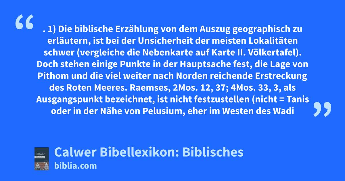 1) Die biblische Erzählung von dem Auszug geographisch zu erläutern, ist bei der Unsicherheit der meisten Lokalitäten schwer (vergleiche die Nebenkarte auf Karte II. Völkertafel). Doch stehen einige Punkte in der Hauptsache fest, die Lage von Pithom und die viel weiter nach Norden reichende Erstreckung des Roten Meeres. Raemses, 2Mos. 12, 37; 4Mos. 33, 3, als Ausgangspunkt bezeichnet, ist nicht festzustellen (nicht = Tanis oder in der Nähe von Pelusium, eher im Westen des Wadi Tumilat bei Tell el-Kebir oder Belbês). Dagegen ist von Naville Pithom in Tell el-Maschuta südlich am Süßwasser-Kanal im Wadi Tumilat festgestellt worden. Sukkoth soll nach Naville den Bezirk von Pithom bezeichnen und auch der profane Name dieser Stadt sein (ägyptisch Thuku oder Thekot). Naville will auch entdeckt haben, dass die Stadt Hero oder Heroonpolis, nach der die Alten den Meerbusen von Sues benannten, der griechische Name von Pithom oder doch dicht dabei war. So scheint es ganz wahrscheinlich, dass das Rote Meer sich ziemlich über Sues nach Norden, wenigstens bis zu den Bitterseen oder bis zu dem Timsahsee erstreckte.