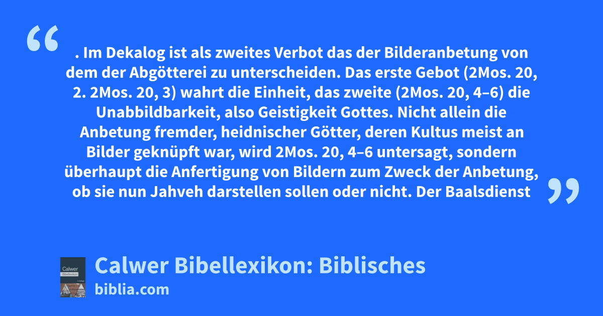 Bilderdienst. Im Dekalog ist als zweites Verbot das der Bilderanbetung von dem der Abgötterei zu unterscheiden. Das erste Gebot (2Mos. 20, 2. 2Mos. 20, 3) wahrt die Einheit, das zweite (2Mos. 20, 4–6) die Unabbildbarkeit, also Geistigkeit Gottes. Nicht allein die Anbetung fremder, heidnischer Götter, deren Kultus meist an Bilder geknüpft war, wird 2Mos. 20, 4–6 untersagt, sondern überhaupt die Anfertigung von Bildern zum Zweck der Anbetung, ob sie nun Jahveh darstellen sollen oder nicht.