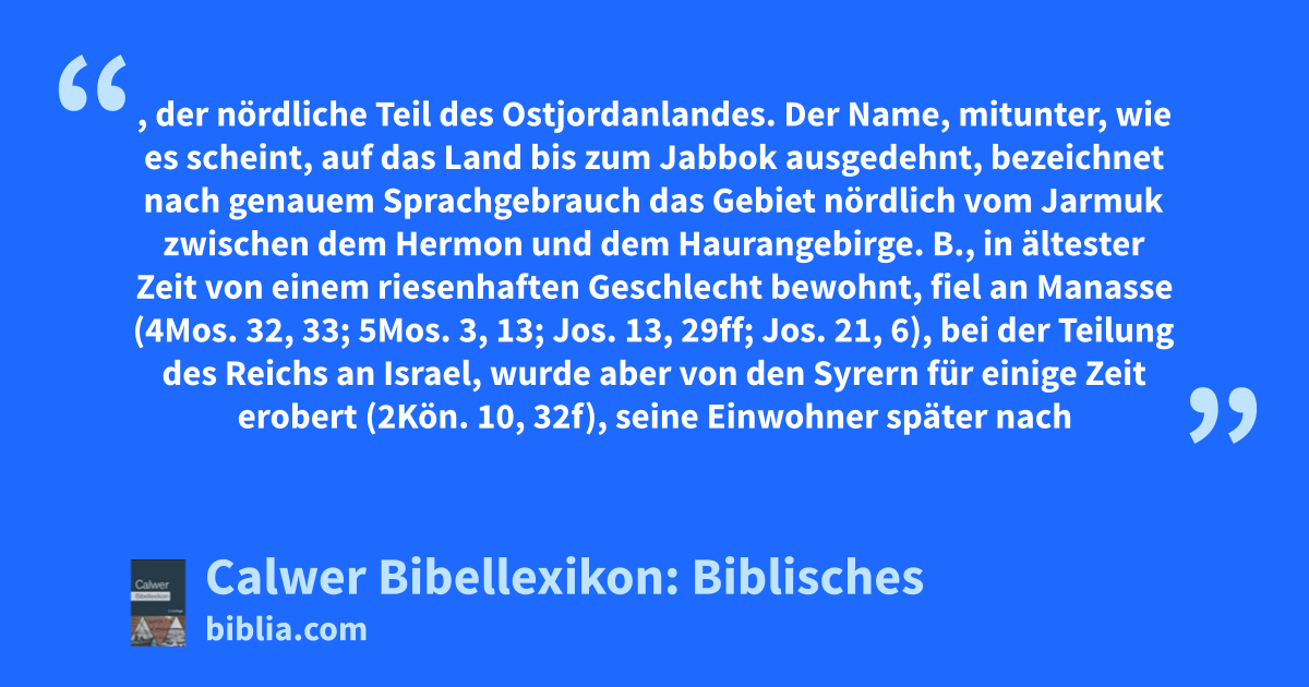 Basan, der nördliche Teil des Ostjordanlandes. Der Name, mitunter, wie es scheint, auf das Land bis zum Jabbok ausgedehnt, bezeichnet nach genauem Sprachgebrauch das Gebiet nördlich vom Jarmuk zwischen dem Hermon und dem Haurangebirge. B., in ältester Zeit von einem riesenhaften Geschlecht bewohnt, fiel an Manasse (4Mos. 32, 33; 5Mos. 3, 13; Jos. 13, 29ff; Jos. 21, 6), bei der Teilung des Reichs an Israel, wurde aber von den Syrern für einige Zeit erobert (2Kön. 10, 32f), seine Einwohner später nach Assyrien weggeführt (2Kön. 15, 29). Die einzelnen Teile des Landes sind: das Dscholan im Westen, nördlich und mitten steinig, bedeckt mit Lavamassen und vielen erloschenen Vulkanen, südlich eben, mit Ackerbau und Viehzucht, vergleiche die fetten Weiden, starken Kühe und Stiere, Schafherden B., Jer. 50, 19; Micha 7, 14; Psa. 22, 13; 5Mos. 32, 14; dem Dscholan-Gaulanitis (nach der Stadt Golan) entsprechen die Landschaften Gesur und Maecha (s. d.). Dieses westliche Gebiet wird an manchen Stellen auch von B. unterschieden (Jos. 12, 4f; Jes. 13, 11f) und dieser Name der Hauran-Ebene gegeben. Östlich von Dscholan kommt die aus Lava und Basalt gebildete Hauran-Ebene, die bis an den Fuß des Haurangebirges hinzieht. Die „Eichen von B.“ (Jes. 2, 13; Sach. 11, 2; Hes. 27, 6) gehören jetzt nur noch dem Gebirge an, während die Ebene selbst ohne Baumwuchs, aber sehr fruchtbar ist. Es ist die Kornkammer Syriens, jetzt bei geordneten politischen Verhältnissen und von der Eisenbahn durchzogen, in bedeutendem Ausschwung. Die Hauran-Ebene, jetzt en-Nukra, entspricht etwa den alten Provinzen Batanäa und Auranitis. Nördlich davon ist ein zerrissenes, höhlenreiches Lavaplateau, jetzt el-Ledschah, wahrscheinlich die alte Trachonitis. Das ganze Land B. war einer der herrlichsten und fruchtbarsten Teile des Landes und wird als solches in vielen Schriftstellen fast sprichwörtlich erwähnt, ähnlich wie die Berge Karmel und Libanon und die Ebene Saron, vergleiche z. B. Nah. 1, 4 und die oben angeführten Stellen.