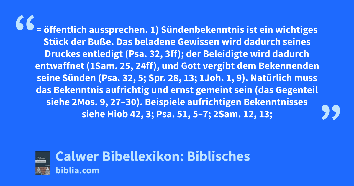 1) Sündenbekenntnis ist ein wichtiges Stück der Buße. Das beladene Gewissen wird dadurch seines Druckes entledigt (Psa. 32, 3ff); der Beleidigte wird dadurch entwaffnet (1Sam. 25, 24ff), und Gott vergibt dem Bekennenden seine Sünden (Psa. 32, 5; Spr. 28, 13; 1Joh. 1, 9). Natürlich muss das Bekenntnis aufrichtig und ernst gemeint sein (das Gegenteil siehe 2Mos. 9, 27–30). Beispiele aufrichtigen Bekenntnisses siehe Hiob 42, 3; Psa. 51, 5–7; 2Sam. 12, 13; 2Sam. 24, 10; der verlorene Sohn, Luk. 15, 21; der Schächer am Kreuz, Luk. 23, 41. Das Bekenntnis muss zwar vor allem Gott gegenüber abgelegt werden, wie die bisherigen Stellen zeigen; aber es hat in vielen Fällen besonderen Wert, das Bekenntnis auch vor Menschen abzulegen (Jak. 5, 16), denn das Bekenntnis ist dann umso gewisser ein aufrichtiges; und auch die Vergebung Gottes kann nur unter dieser Voraussetzung durch Menschenmund uns zugesichert werden.