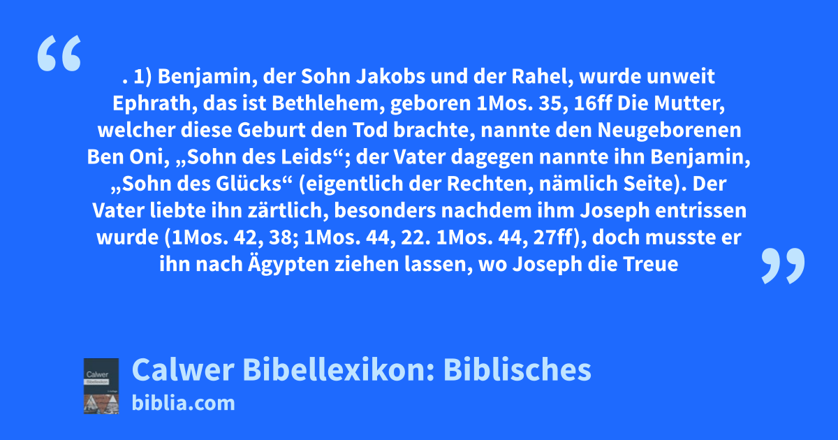 1) Benjamin, der Sohn Jakobs und der Rahel, wurde unweit Ephrath, das ist Bethlehem, geboren 1Mos. 35, 16ff Die Mutter, welcher diese Geburt den Tod brachte, nannte den Neugeborenen Ben Oni, „Sohn des Leids“; der Vater dagegen nannte ihn Benjamin, „Sohn des Glücks“ (eigentlich der Rechten, nämlich Seite). Der Vater liebte ihn zärtlich, besonders nachdem ihm Joseph entrissen wurde (1Mos. 42, 38; 1Mos. 44, 22. 1Mos. 44, 27ff), doch musste er ihn nach Ägypten ziehen lassen, wo Joseph die Treue der Brüder an Benjamin, der auch ihm der Liebste war, auf die Probe stellte, Juda aber tapfer für ihn einstand (Kap. 1Mos. 43. 1Mos. 44). Manche halten Benjamin nur für eine Personifikation des Stammes. Benjamins Kinder siehe 1Mos. 46, 21; 1Chr. 8, 1ff; 4Mos. 26, 38ff, siehe auch Jakob, Rahel, Joseph.