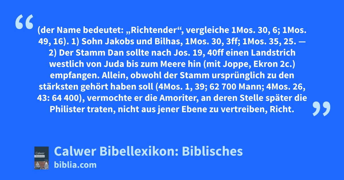 Allein, obwohl der Stamm ursprünglich zu den stärksten gehört haben soll (4Mos. 1, 39; 62 700 Mann; 4Mos. 26, 43: 64 400), vermochte er die Amoriter, an deren Stelle später die Philister traten, nicht aus jener Ebene zu vertreiben, Richt. 1, 34f; hat immerhin nach Richt. 5, 17 eine Zeitlang am Meere gewohnt. Um Raum zu gewinnen, machte ein Teil des Stammes bald nach Josuas Tod einen (anhangsweise erst am Schluss des Richterbuches erzählten) Auswanderungszug nach dem äußersten Norden des Landes, Richt. 18, 1ff. Dort eroberten sie die Stadt Lais, fortan Dan geheißen. Die im Südwesten zurückgebliebenen Daniten, aus denen Simson, der berühmteste Sprößling des Stammes, hervorging (Richt. 13, vergleiche auch den Segen Jakobs, 1Mos. 49, 16f), erscheinen später nicht mehr selbständig. Hesekiel weist (Hes. 48, 1) dem Stamm ein Erbe im Norden an. Offb. 7, 5ff fehlt er.