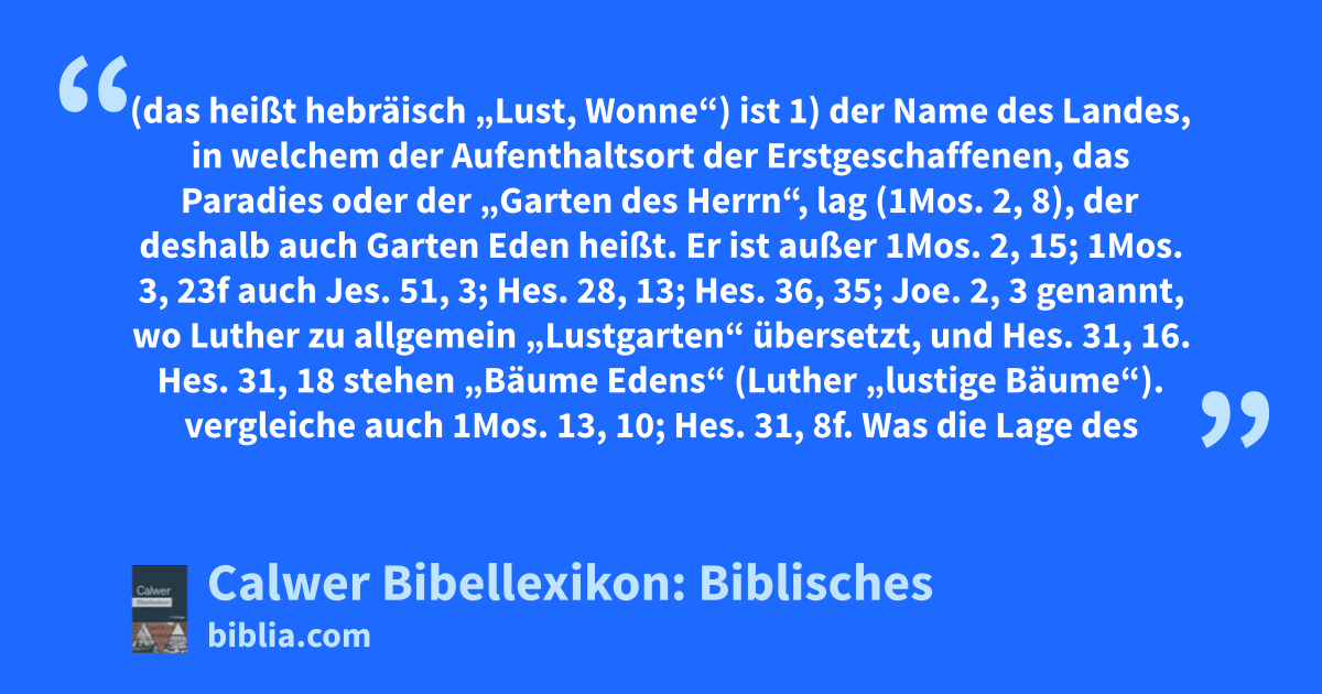 Er ist außer 1Mos. 2, 15; 1Mos. 3, 23f auch Jes. 51, 3; Hes. 28, 13; Hes. 36, 35; Joe. 2, 3 genannt, wo Luther zu allgemein „Lustgarten“ übersetzt, und Hes. 31, 16. Hes. 31, 18 stehen „Bäume Edens“ (Luther „lustige Bäume“). vergleiche auch 1Mos. 13, 10; Hes. 31, 8f. Was die Lage des Landes Eden betrifft, so wird sie 1Mos. 2, 8 als eine von Kanaan aus östliche bezeichnet, wenn nicht der Sinn ist, der Garten habe im Osten von Eden gelegen. Näher wird die Ortslage des letzteren durch vier Ströme bestimmt, die sich dort aus einem Strom abzweigen.