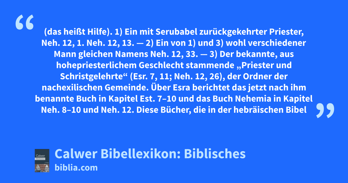 — 3) Der bekannte, aus hohepriesterlichem Geschlecht stammende „Priester und Schristgelehrte“ (Esr. 7, 11; Neh. 12, 26), der Ordner der nachexilischen Gemeinde. Über Esra berichtet das jetzt nach ihm benannte Buch in Kapitel Est. 7–10 und das Buch Nehemia in Kapitel Neh. 8–10 und Neh. 12.