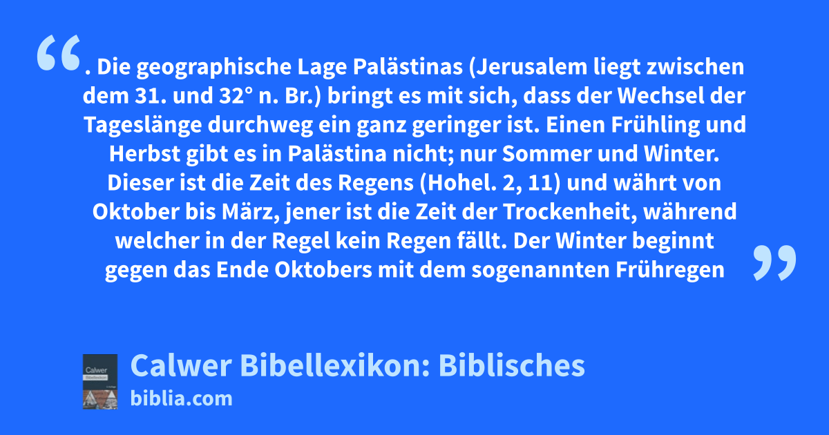 Frühregen, Spatregen. Die geographische Lage Palästinas (Jerusalem liegt zwischen dem 31. und 32° n. Br.) bringt es mit sich, dass der Wechsel der Tageslänge durchweg ein ganz geringer ist. Einen Frühling und Herbst gibt es in Palästina nicht; nur Sommer und Winter.