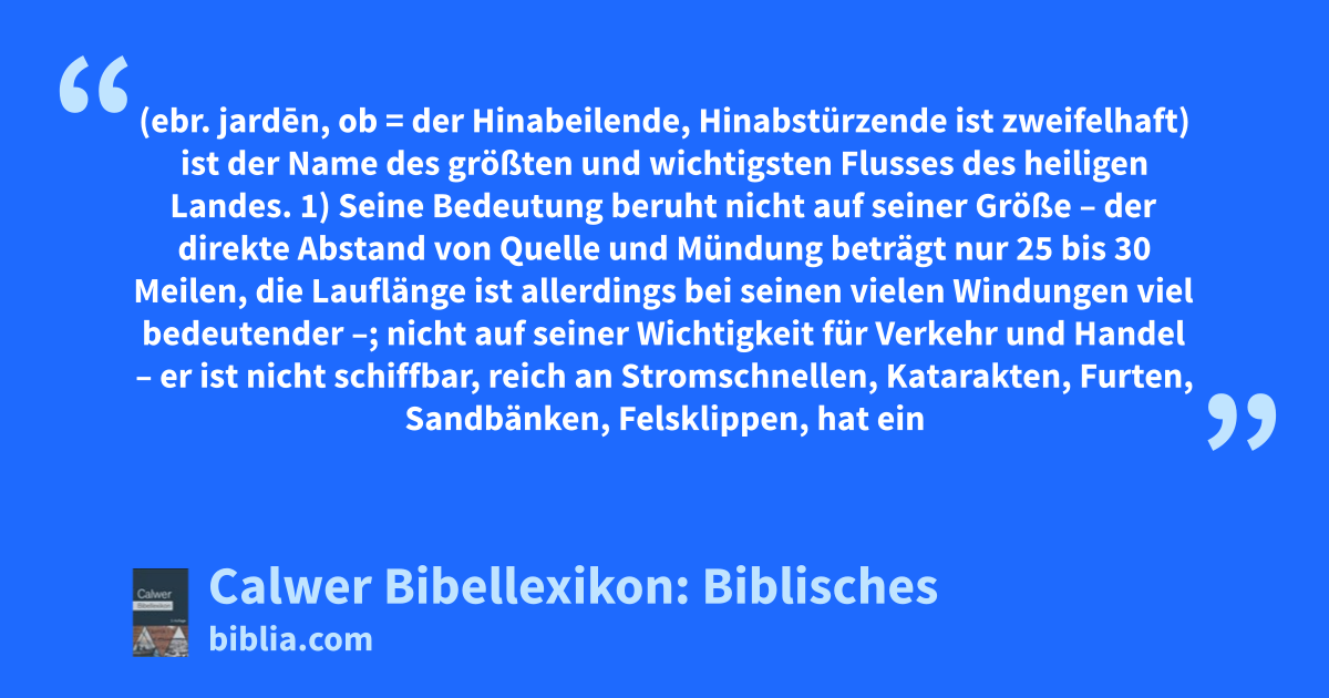 Jordan (ebr. jardēn, ob = der Hinabeilende, Hinabstürzende ist zweifelhaft) ist der Name des größten und wichtigsten Flusses des heiligen Landes.