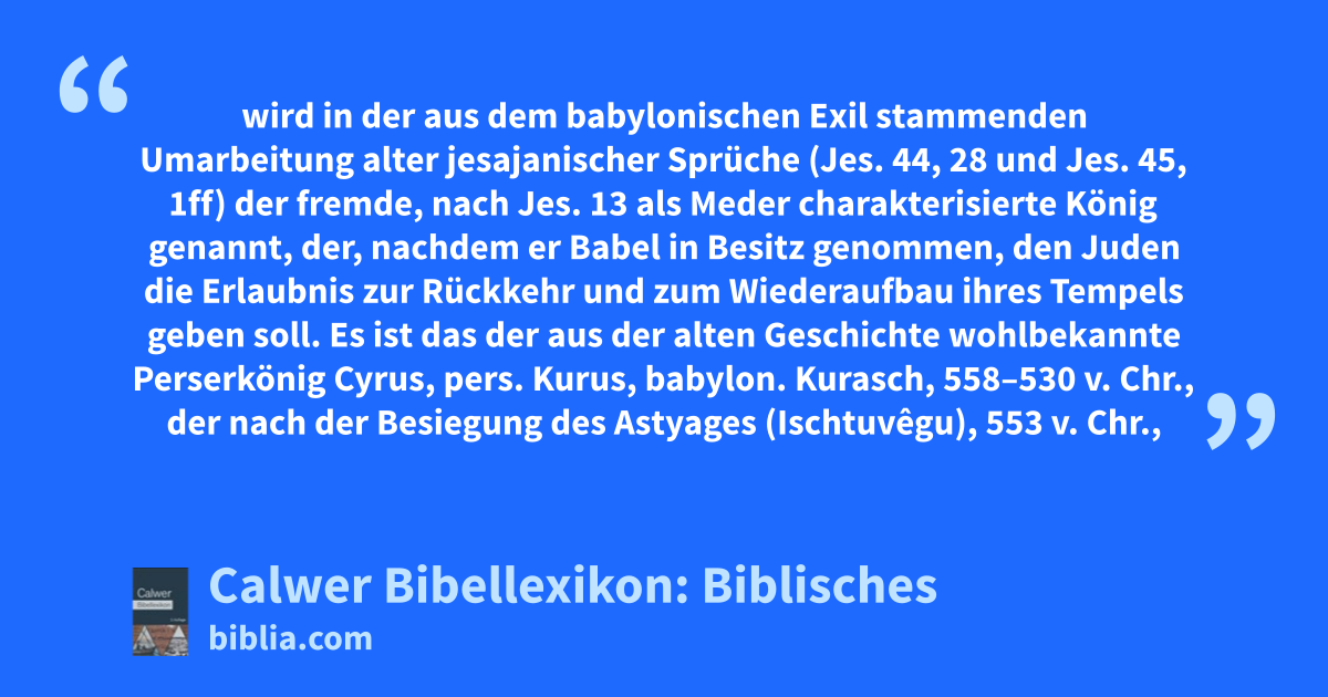 Kores wird in der aus dem babylonischen Exil stammenden Umarbeitung alter jesajanischer Sprüche (Jes. 44, 28 und Jes. 45, 1ff) der fremde, nach Jes. 13 als Meder charakterisierte König genannt, der, nachdem er Babel in Besitz genommen, den Juden die Erlaubnis zur Rückkehr und zum Wiederaufbau ihres Tempels geben soll. Es ist das der aus der alten Geschichte wohlbekannte Perserkönig Cyrus, pers. Kurus, babylon. Kurasch, 558–530 v. Chr., der nach der Besiegung des Astyages (Ischtuvêgu), 553 v. Chr., auch zugleich Herrscher von Medien (siehe dort) und nach der Besitznahme Babels, 539 v. Chr., König von Babylonien (als solcher 538–530) geworden war.