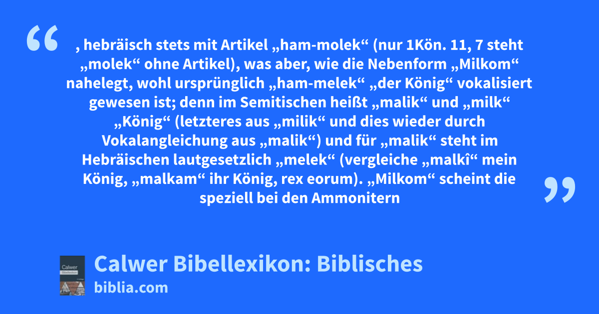 „Milkom“ scheint die speziell bei den Ammonitern übliche Form gewesen zu sein (vergleiche 1Kön. 11, 3 und 1Kön. 11, 5, dagegen 1Kön. 11, 7 „Molek“, 2Kön. 23, 10, „ham-molek“), während die Jer. 49, 1. Jer. 49, 3, Zef. 1, 5 und wahrscheinlich auch 2Sam. 12, 30 begegnende Nebenform „malkam“ („ihr König“, siehe oben) eine volksetymologische Umschreibung von „Milkom“ („milk“ mit der sogenannten Mimation, wie in südarabischen Eigennamen) darstellt. Auch Jes. 30, 33 ist „Moloch“ mit „dem Könige“ gemeint, wie die vorhergehende Feuerstätte („tophet“-Luther: Grube) nahelegt; eine der charakteristischsten Seiten dieses Gottkönigs war es ja, dass ihm die Erstgeburt verbrannt wurde oder dass man sie wenigstens symbolisch für ihn durchs Feuer gehen ließ (3Mos. 18, 21; 3Mos. 20, 2–5; Jer. 32, 35 und öfter), welch grausame Sitte dann von den umwohnenden Völkern, besonders den Ammonitern (siehe oben), auch in Israel Eingang fand, wie solches zum Beispiel ausdrücklich von den judäischen Königen Ahas und Manasse (und vergleiche für Israel 2Kön. 17, 17 und Hes. 23, 27) berichtet wird.