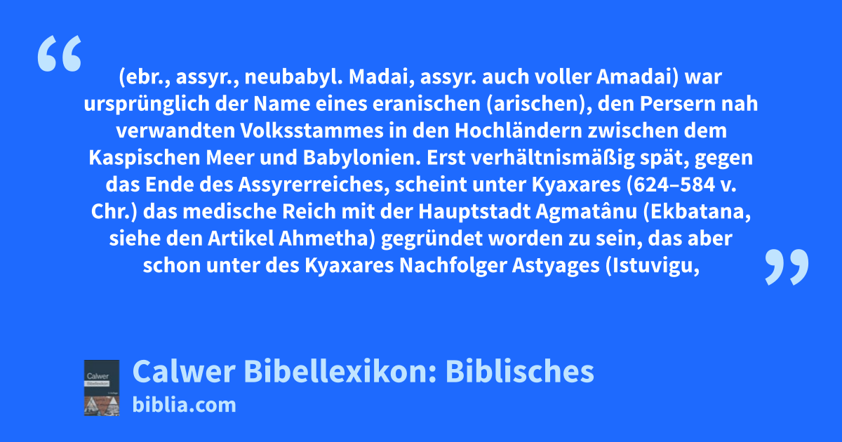 Erst verhältnismäßig spät, gegen das Ende des Assyrerreiches, scheint unter Kyaxares (624–584 v. Chr.) das medische Reich mit der Hauptstadt Agmatânu (Ekbatana, siehe den Artikel Ahmetha) gegründet worden zu sein, das aber schon unter des Kyaxares Nachfolger Astyages (Istuvigu, 584 bis 553) dem Perserkönig Kyros zur Beute fiel. Das Zentrum der altmedischen Macht, in welche sich zur Assyrerzeit noch verschiedene Stammesfürsten teilten, war wohl das unweit vom heutigen Teheran in Nord-Persien gelegene Ragâ (Rhages des Buches Tobit, Tob. 1, 16; Tob. 4, 21 und öfter), heute Rai, südlich vom Demawend, der als das Biknigebirg schon 744 v. Chr. von Tiglatpileser IV. erwähnt wird, während der „weiße Berg“, bis zu welchem Samfi-Hadad VI. (824–812) vordrang, vermutlich der Elwend bei Ekbatana war. Der wahrscheinlich von Sargon nach Medien deportierten Israeliten wird 2Kön. 17, 16 und 2Kön. 18, 11 gedacht. Jeremia weissagt schon unter Nebukadnezar den durch die „Könige der Meder“ herbeizuführenden Sturz Babels (Jer. 51, 11. Jer. 51, 28 und vergleiche Jer. 25, 25 und Jes. 21, 2, wo auch Elam mitgenannt ist) und Jes. 13, 17f werden die Meder in ähnlichem Zusammenhang als grausame Bogenschützen, die weder Silber suchen noch nach Gold fragen, bezeichnet.
