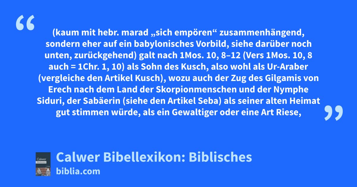 Nimrod (kaum mit hebr. marad „sich empören“ zusammenhängend, sondern eher auf ein babylonisches Vorbild, siehe darüber noch unten, zurückgehend) galt nach 1Mos. 10, 8–12 (Vers 1Mos. 10, 8 auch = 1Chr. 1, 10) als Sohn des Kusch, also wohl als Ur-Araber (vergleiche den Artikel Kusch), wozu auch der Zug des Gilgamis von Erech nach dem Land der Skorpionmenschen und der Nymphe Siduri, der Sabäerin (siehe den Artikel Seba) als seiner alten Heimat gut stimmen würde, als ein Gewaltiger oder eine Art Riese, gibbôr (so, gabbâr, nennen die Araber den Orion), auf Erden, vor allem aber als „ein gibbôr der Jagd vor Jahwe“ (Vers 1Mos. 10, 9), wozu Jensen den roten Stern Beteigeuze im gleichen Orion, den Pfeilstern der Babylonier und zugleich den Stern des assyrischen Jagdgottes Ninib, verglichen hat, also ein gewaltiger Jäger vor Jahwe, welche Redensart geradezu sprichwörtlich in Israel wurde, und ferner als der Gründer der älteren babylonischen Städte Babel, Erech, Akkad und Chalne = Nippur (siehe die betreffenden Artikel) und sogar auch Ninives, der Ninib-Stadt (siehe den Artikel Assur, Assyrien und vergleiche Micha 5, 5, wo Assyrien das Land Nimrods genannt wird).