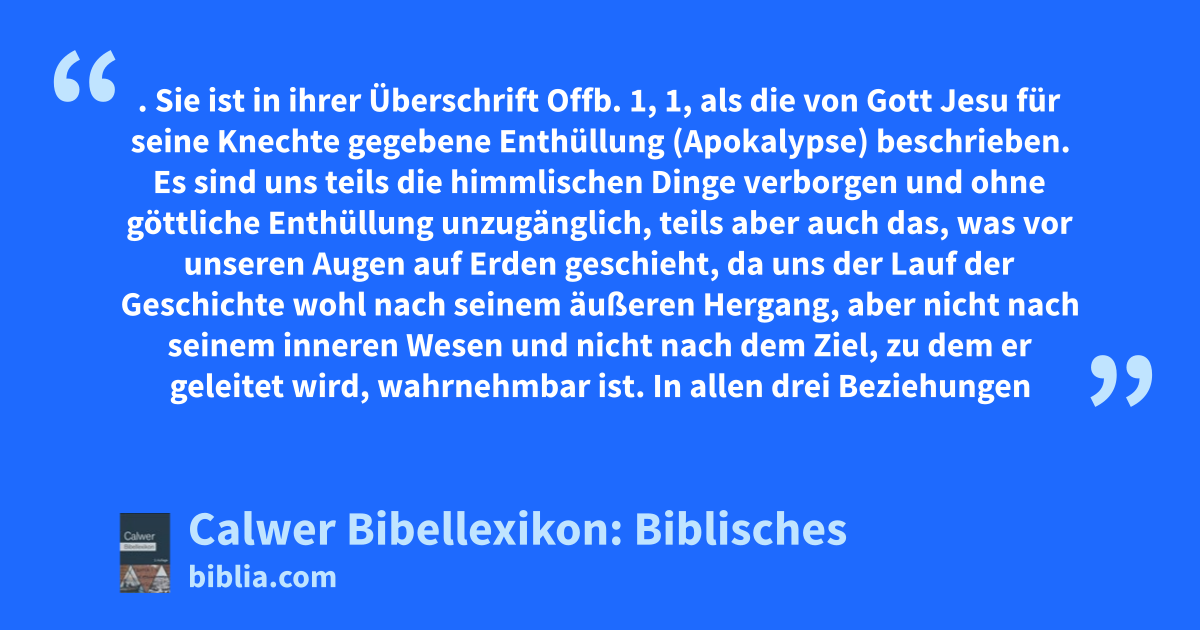 Offenbarung Johannis. Sie ist in ihrer Überschrift Offb. 1, 1, als die von Gott Jesu für seine Knechte gegebene Enthüllung (Apokalypse) beschrieben. Es sind uns teils die himmlischen Dinge verborgen und ohne göttliche Enthüllung unzugänglich, teils aber auch das, was vor unseren Augen auf Erden geschieht, da uns der Lauf der Geschichte wohl nach seinem äußeren Hergang, aber nicht nach seinem inneren Wesen und nicht nach dem Ziel, zu dem er geleitet wird, wahrnehmbar ist. In allen drei Beziehungen bringt die Offenbarung Johannis in das, was uns verhüllt ist, Licht. Sie öffnet uns einen Blick in den Himmel und zeigt, wie das, was auf Erden geschieht, im Himmel anhebt und die Nachwirkung himmlischer Vorgänge ist, wie alles auch wieder in den Himmel zurückwirkt im Lob und Preis der himmlischen Wesen. Wir sollen so Himmel und Erde in ihrem Zusammenhang fassen und die irdische Geschichte vom himmlischen Standpunkt aus betrachten lernen.