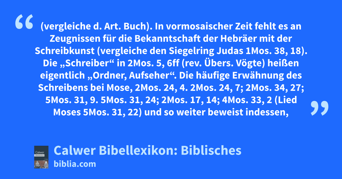 Schreiben, Schreiber, Schreibkunst, Schrift (vergleiche d. Art. Buch). In vormosaischer Zeit fehlt es an Zeugnissen für die Bekanntschaft der Hebräer mit der Schreibkunst (vergleiche den Siegelring Judas 1Mos. 38, 18). Die „Schreiber“ in 2Mos. 5, 6ff (rev. Übers. Vögte) heißen eigentlich „Ordner, Aufseher“.