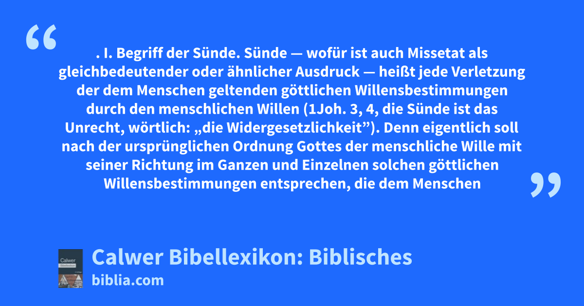 Sünde, sündigen. I. Begriff der Sünde. Sünde — wofür ist auch Missetat als gleichbedeutender oder ähnlicher Ausdruck — heißt jede Verletzung der dem Menschen geltenden göttlichen Willensbestimmungen durch den menschlichen Willen (1Joh. 3, 4, die Sünde ist das Unrecht, wörtlich: „die Widergesetzlichkeit”). Denn eigentlich soll nach der ursprünglichen Ordnung Gottes der menschliche Wille mit seiner Richtung im Ganzen und Einzelnen solchen göttlichen Willensbestimmungen entsprechen, die dem Menschen teils als unmittelbarer Sinn und Trieb eingepflanzt (Röm. 2, 15), teils als bestimmtes Gesetz (Röm. 2, 12) geoffenbart sind. Sie beziehen sich auf alle Äußerungen des menschlichen Willens, auf Gedanken, Worte und Werke (Matth. 15, 19; vergleiche die 10 Gebote). Rein unwillkürliche Erlebnisse des Menschen fallen nicht unter den Begriff der Sünde (vergleiche z. B. Besessenheit).