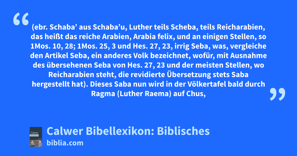 Dieses Saba nun wird in der Völkertafel bald durch Ragma (Luther Raema) auf Chus, das heißt Kusch (so 1Mos. 10, 7), bald auf die joktanidischen Araber (so 1Mos. 10, 28) und in einer ähnlichen genealogischen Stammtafel, 1Mos. 25, 3 auf Abraham und Ketura zurückgeführt, was nur, da es ja auch ein zentralarabisches Kusch gab (siehe den Artikel Kusch), beweist, dass den Hebräern Saba zusammen mit dem engverwandten Dedan (1Mos. 10, 7; 1Mos. 25, 3 und Hes. 38, 13), das sicher in Nordwestarabien zu suchen ist, als ein nordarabischer Stamm, dessen früheste Wohnsitze irgendwo zwischen Midian und Ostarabien, wahrscheinlich in der Nähe von Dûma (siehe daselbst) lagen. Die Sabäer waren dann später, etwa von 700 vor Christus an, nach außerbiblischen Zeugnissen, das bedeutendste Volk Südarabiens, in dessen südwestlichem Teil, dem sogenannten Jemen, sie wohnten. Ihre bisher nur von wenigen europäischen Forschungsreisenden (Arnaud, Halevy und Eduard Glaser) besuchte Hauptstadt war Mariaba (heute Mârib), drei Tagreisen östlich von der türkischen Hauptstadt San‘â.