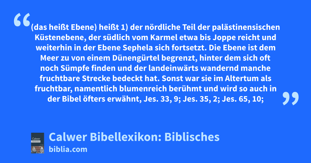1) der nördliche Teil der palästinensischen Küstenebene, der südlich vom Karmel etwa bis Joppe reicht und weiterhin in der Ebene Sephela sich fortsetzt. Die Ebene ist dem Meer zu von einem Dünengürtel begrenzt, hinter dem sich oft noch Sümpfe finden und der landeinwärts wandernd manche fruchtbare Strecke bedeckt hat. Sonst war sie im Altertum als fruchtbar, namentlich blumenreich berühmt und wird so auch in der Bibel öfters erwähnt, Jes. 33, 9; Jes. 35, 2; Jes. 65, 10; 1Chr. 27, 29; auch Apg. 9, 35.