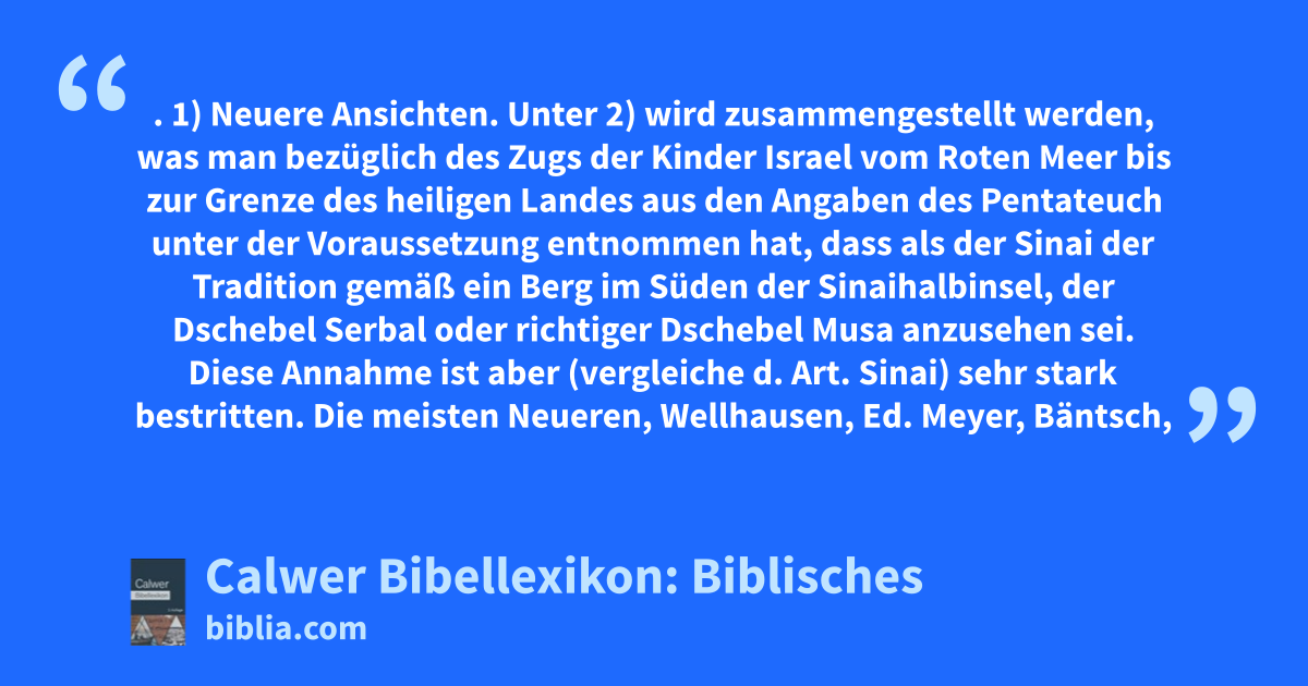 1) Neuere Ansichten. Unter 2) wird zusammengestellt werden, was man bezüglich des Zugs der Kinder Israel vom Roten Meer bis zur Grenze des heiligen Landes aus den Angaben des Pentateuch unter der Voraussetzung entnommen hat, dass als der Sinai der Tradition gemäß ein Berg im Süden der Sinaihalbinsel, der Dschebel Serbal oder richtiger Dschebel Musa anzusehen sei. Diese Annahme ist aber (vergleiche d. Art. Sinai) sehr stark bestritten. Die meisten Neueren, Wellhausen, Ed. Meyer, Bäntsch, Guthe u. a. bestreiten, dass die Autoren eine klare Vorstellung von dem Gesetzgebungsberg gehabt, dass sie ihn insbesondere im Süden der Halbinsel gesucht haben. Sie behaupten, dass nach den ältesten Quellen er in der Gegend von Kades (so z. B. Guthe und Kittel) oder im Osten oder Südosten des älanitischen Meerbusens (Wellhausen, Ed. Meyer, Bäntsch, Fritz Hommel) gelegen habe und dass die verschiedenen Quellen über die Lage differieren.