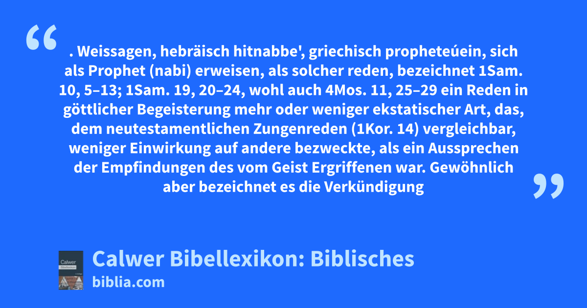 Weissagen, Weissager, Weissagung. Weissagen, hebräisch hitnabbe', griechisch propheteúein, sich als Prophet (nabi) erweisen, als solcher reden, bezeichnet 1Sam. 10, 5–13; 1Sam. 19, 20–24, wohl auch 4Mos. 11, 25–29 ein Reden in göttlicher Begeisterung mehr oder weniger ekstatischer Art, das, dem neutestamentlichen Zungenreden (1Kor. 14) vergleichbar, weniger Einwirkung auf andere bezweckte, als ein Aussprechen der Empfindungen des vom Geist Ergriffenen war.