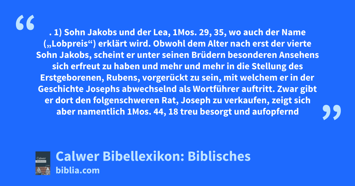 1) Sohn Jakobs und der Lea, 1Mos. 29, 35, wo auch der Name („Lobpreis“) erklärt wird. Obwohl dem Alter nach erst der vierte Sohn Jakobs, scheint er unter seinen Brüdern besonderen Ansehens sich erfreut zu haben und mehr und mehr in die Stellung des Erstgeborenen, Rubens, vorgerückt zu sein, mit welchem er in der Geschichte Josephs abwechselnd als Wortführer auftritt. Zwar gibt er dort den folgenschweren Rat, Joseph zu verkaufen, zeigt sich aber namentlich 1Mos. 44, 18 treu besorgt und aufopfernd für seinen alten Vater. Weniger rühmlich benimmt er sich freilich 1Mos. 38. Aber auch dort überwindet zuletzt sein Gerechtigkeitsgefühl. Seine verwitwete Sohnsfrau Thamar hatte nach semitischem Familienrecht Anspruch auf Nachkommenschaft vonseiten ihres Schwagers, den Juda ihr vorenthielt; so wusste sie sich von Juda selbst ohne dessen Wissen und Wollen solche zu verschaffen. — In Würdigung seiner den anderen überlegenen Tatkraft und Treue zeichnete ihn dann auch sein sterbender Vater, 1Mos. 49, 8ff, vor den übrigen aus und sprach ihm die Führerschaft zu, welche sein Stamm, ob auch stets Ephraim ihm dieselbe streitig zu machen suchte, behauptete. Das Verhältnis dieser beiden Stämme wird 1Chr. 5, 2 so bestimmt, dass Juda die Erstgeburtswürde, die Oberherrschaft, Joseph dagegen den Erstgeburtsanteil (doppeltes Erbe in Ephraim und Manasse) erhielt.