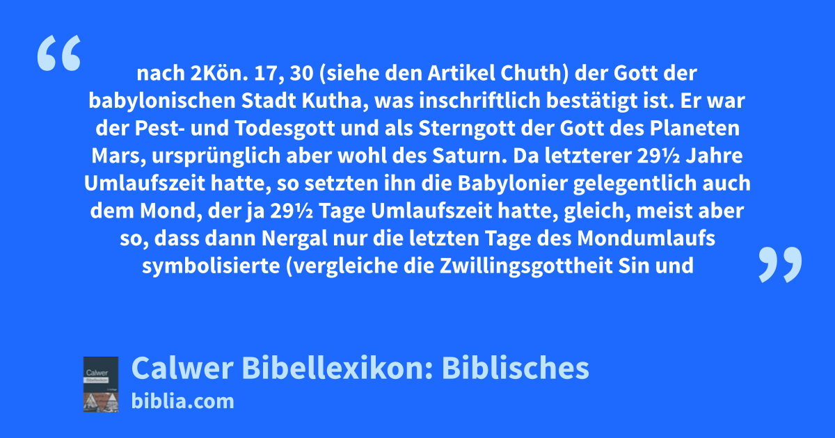 Nergal nach 2Kön. 17, 30 (siehe den Artikel Chuth) der Gott der babylonischen Stadt Kutha, was inschriftlich bestätigt ist. Er war der Pest- und Todesgott und als Sterngott der Gott des Planeten Mars, ursprünglich aber wohl des Saturn.