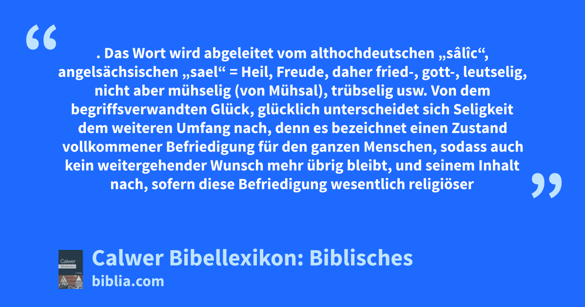 Schon im Alten Testament sind zwei Ausdrücke durch Luther mit „selig“ wiedergegeben worden. Der eine ist das hebräische „aschre“, weitaus in den meisten Fällen mit „wohl“ übersetzt (so gleich Psa. 1, 1), mit Seligkeit aber 1Kön. 10, 8, wo es nur überhaupt so viel als glücklich ist, wie vorwiegend auch Spr. 3, 18; nur Hiob 5, 17 tritt die religiöse Beziehung ganz in den Vordergrund.