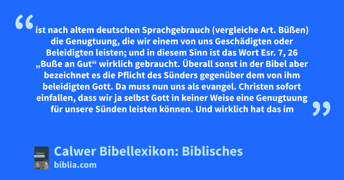 Buße ist nach altem deutschen Sprachgebrauch (vergleiche Art. Büßen) die Genugtuung, die wir einem von uns Geschädigten oder Beleidigten leisten; und in diesem Sinn ist das Wort Esr. 7, 26 „Buße an Gut“ wirklich gebraucht. Überall sonst in der Bibel aber bezeichnet es die Pflicht des Sünders gegenüber dem von ihm beleidigten Gott. Da muss nun uns als evangel. Christen sofort einfallen, dass wir ja selbst Gott in keiner Weise eine Genugtuung für unsere Sünden leisten können. Und wirklich hat das im Hebräischen und Griechischen Grundtext stehende Wort eine ganz andere Bedeutung als „Genugtuung“. Es bedeutet: Reue, Sinnesänderung. Es ist ein Beweis, wie weit die katholische Kirche des Mittelalters von der Erkenntnis des biblischen Heilswegs abgekommen war, dass in ihr das Wort „Buße“ das anfänglich auch in ihr richtig gebrauchte Wort „Reue“ ganz verdrängte, wo es sich um Erlangung der Sündenvergebung handelt.