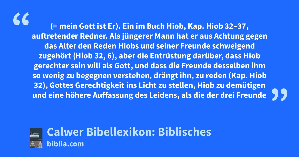 Elihu (= mein Gott ist Er). Ein im Buch Hiob, Kap. Hiob 32–37, auftretender Redner. Als jüngerer Mann hat er aus Achtung gegen das Alter den Reden Hiobs und seiner Freunde schweigend zugehört (Hiob 32, 6), aber die Entrüstung darüber, dass Hiob gerechter sein will als Gott, und dass die Freunde desselben ihm so wenig zu begegnen verstehen, drängt ihn, zu reden (Kap. Hiob 32), Gottes Gerechtigkeit ins Licht zu stellen, Hiob zu demütigen und eine höhere Auffassung des Leidens, als die der drei Freunde vorzutragen (vergleiche Art. Hiob).