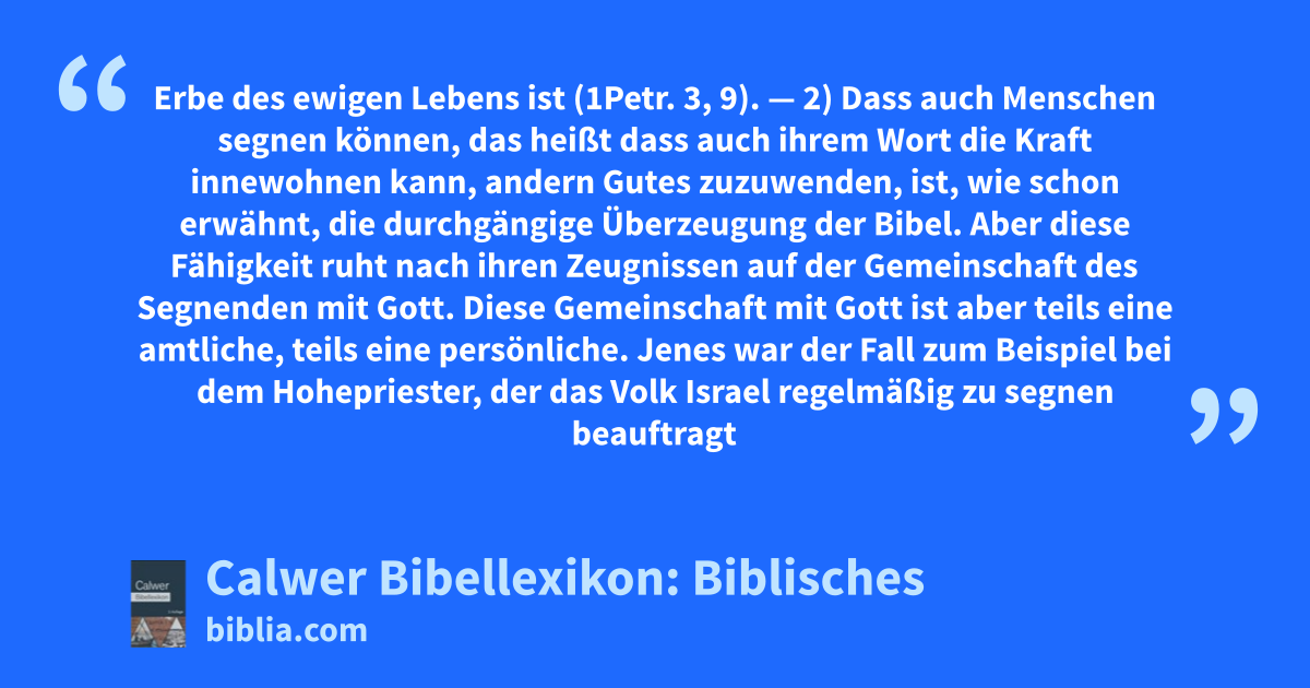 — 2) Dass auch Menschen segnen können, das heißt dass auch ihrem Wort die Kraft innewohnen kann, andern Gutes zuzuwenden, ist, wie schon erwähnt, die durchgängige Überzeugung der Bibel. Aber diese Fähigkeit ruht nach ihren Zeugnissen auf der Gemeinschaft des Segnenden mit Gott. Diese Gemeinschaft mit Gott ist aber teils eine amtliche, teils eine persönliche. Jenes war der Fall zum Beispiel bei dem Hohepriester, der das Volk Israel regelmäßig zu segnen beauftragt war, 4Mos. 6, 23ff, vergleiche 3Mos. 9, 22. 3Mos. 9, 23, und zwar zum Schluss des Opfergottesdienstes (Sir. 50, 22). Etwas ähnliches ist es mit dem Segnen der Eltern: auch diese haben kraft ihres Elternamtes eine gewisse Vollmacht zu segnen, die nicht durchweg von ihrer persönlichen Gemeinschaft mit Gott abhängig ist (vergleiche den Segen Isaaks 1Mos. 27, 4ff, Jakobs 1Mos. 48, 15ff; 1Mos. 49, 26, vergleiche Sir. 3, 10. Sir. 3, 11). In anderen Fällen ist es die rein persönliche Gemeinschaft mit Gott, welche zum Segnen fähig macht, zum Beispiel bei Melchisedek (1Mos. 14, 19); bei Simeon (Luk. 2, 34); im höchsten Grade bei Jesus (Mark. 10, 16; Luk. 24, 50f). Und so kann Jesus seine Jünger geradezu auffordern zu segnen (Matth. 5, 44, vergleiche Röm. 12, 14). Dass bei solchen menschlichen Segnungen alles von Gott abhängt, zeigt sich darin, dass sie auch der Form nach meist in einer Anwünschung und Zuwendung des göttlichen Segens bestehen (vergleiche 4Mos. 6, 24; 1Mos. 14, 19; 1Sam. 23, 21). Im Alten Testament kommt das Segnen auch im täglichen Leben sehr oft vor, zum Beispiel beim Abschiednehmen (1Mos. 24, 60; 1Mos. 32, 1). „Sich segnen“ heißt „sich Glück wünschen“; „sich in dem wahrhaftigen Gott (vergleiche Amen) segnen“ (Jes. 65, 16) heißt: sich sein Glück von dem wahrhaftigen Gott erwünschen mit der Gewissheit, es von ihm allein erlangen zu können. Ähnlich Jer. 4, 2: „die Heiden werden sich in ihm segnen“ (Grundtext), werden sich ihr Glück nicht mehr von den Götzen, sondern von Jahveh erwünschen. Dagegen 1Mos. 12, 3; 1Mos. 18, 18; 1Mos. 22, 18; 1Mos. 26, 4; 1Mos. 28, 14, wo die richtigere Übersetzung lautet: „in dir sollen sich segnen alle Geschlechter auf Erden“ — ist der Sinn des „in dir“: sie sollen sich einen Segen wünschen, wie ihn Abraham von seinem Gott erhält (vergleiche 1Mos. 48, 20).