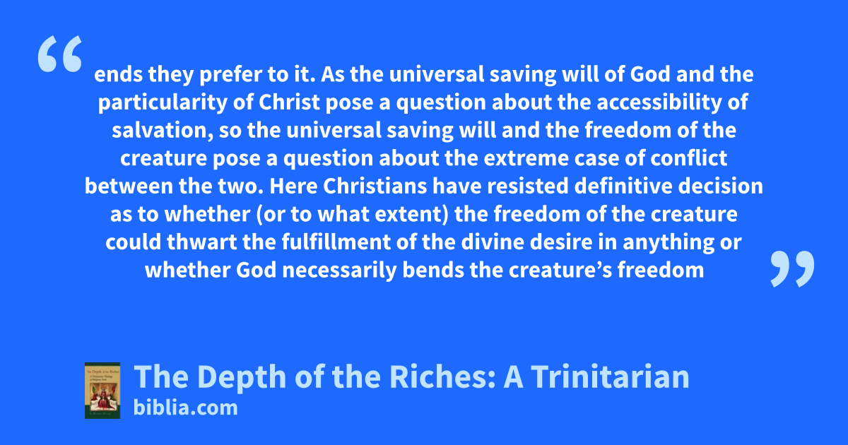 ends they prefer to it. As the universal saving will of God and the particularity of Christ pose a question about the accessibility of salvation, so the universal saving will and the freedom of the creature pose a question about the extreme case of conflict between the two. Here Christians have resisted definitive decision as to whether (or to what extent) the freedom of the creature could thwart the fulfillment of the divine desire in anything or whether God necessarily bends the creature’s freedom