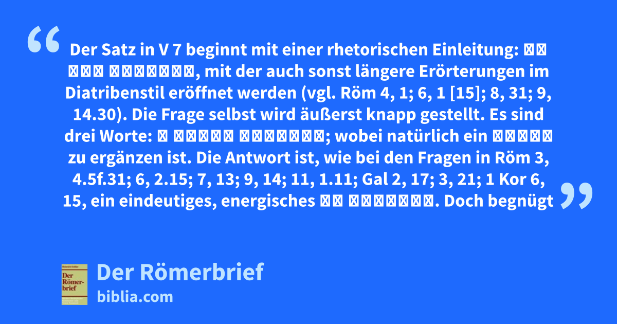 Der Satz in V 7 beginnt mit einer rhetorischen Einleitung: Τί οὖν ἐροῦμεν, mit der auch sonst längere Erörterungen im Diatribenstil eröffnet werden (vgl. Röm 4, 1; 6, 1 [15]; 8, 31; 9, 14.30). Die Frage selbst wird äußerst knapp gestellt. Es sind drei Worte: ὁ νόμος ἁμαρτία; wobei natürlich ein ἐστίν zu ergänzen ist. Die Antwort ist, wie bei den Fragen in Röm 3, 4.5f.31; 6, 2.15; 7, 13; 9, 14; 11, 1.11; Gal 2, 17; 3, 21; 1 Kor 6, 15, ein eindeutiges, energisches μὴ γένοιτο. Doch begnügt