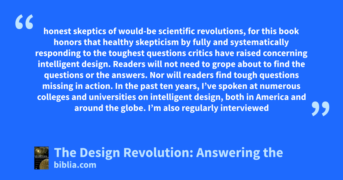 honest skeptics of would-be scientific revolutions, for this book honors that healthy skepticism by fully and systematically responding to the toughest questions critics have raised concerning intelligent design. Readers will not need to grope about to find the questions or the answers. Nor will readers find tough questions missing in action. In the past ten years, I’ve spoken at numerous colleges and universities on intelligent design, both in America and around the globe. I’m also regularly interviewed
