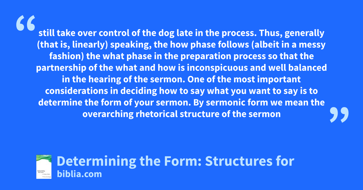 still take over control of the dog late in the process. Thus, generally (that is, linearly) speaking, the how phase follows (albeit in a messy fashion) the what phase in the preparation process so that the partnership of the what and how is inconspicuous and well balanced in the hearing of the sermon. One of the most important considerations in deciding how to say what you want to say is to determine the form of your sermon. By sermonic form we mean the overarching rhetorical structure of the sermon