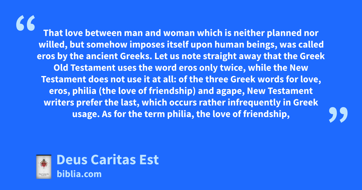 That love between man and woman which is neither planned nor willed, but somehow imposes itself upon human beings, was called eros by the ancient Greeks. Let us note straight away that the Greek Old Testament uses the word eros only twice, while the New Testament does not use it at all: of the three Greek words for love, eros, philia (the love of friendship) and agape, New Testament writers prefer the last, which occurs rather infrequently in Greek usage. As for the term philia, the love of friendship,