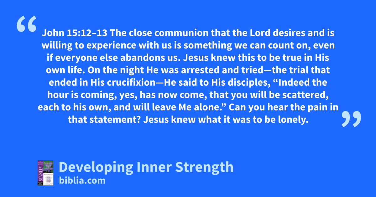 John 15:12–13 The close communion that the Lord desires and is willing to experience with us is something we can count on, even if everyone else abandons us. Jesus knew this to be true in His own life. On the night He was arrested and tried—the trial that ended in His crucifixion—He said to His disciples, “Indeed the hour is coming, yes, has now come, that you will be scattered, each to his own, and will leave Me alone.” Can you hear the pain in that statement? Jesus knew what it was to be lonely.