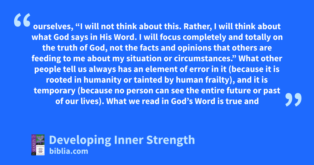 ourselves, “I will not think about this. Rather, I will think about what God says in His Word. I will focus completely and totally on the truth of God, not the facts and opinions that others are feeding to me about my situation or circumstances.” What other people tell us always has an element of error in it (because it is rooted in humanity or tainted by human frailty), and it is temporary (because no person can see the entire future or past of our lives). What we read in God’s Word is true and