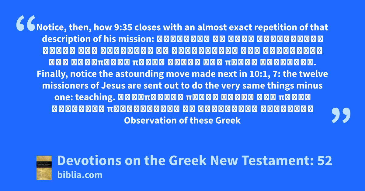 Notice, then, how 9:35 closes with an almost exact repetition of that description of his mission: διδάσκων ἐν ταῖς συναγωγαῖς αὐτῶν καὶ κηρύσσων τὸ εὐαγγέλιον τῆς βασιλείας καὶ θεραπεύων πᾶσαν νόσον καὶ πᾶσαν μαλακίαν. Finally, notice the astounding move made next in 10:1, 7: the twelve missioners of Jesus are sent out to do the very same things minus one: teaching. θεραπεύειν πᾶσαν νόσον καὶ πᾶσαν μαλακίαν πορευόμενοι δὲ κηρύσσετε λέγοντες Observation of these Greek