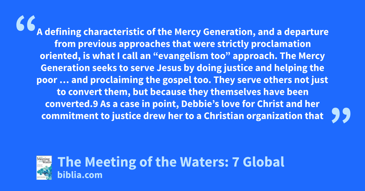 A defining characteristic of the Mercy Generation, and a departure from previous approaches that were strictly proclamation oriented, is what I call an “evangelism too” approach. The Mercy Generation seeks to serve Jesus by doing justice and helping the poor … and proclaiming the gospel too. They serve others not just to convert them, but because they themselves have been converted.9 As a case in point, Debbie’s love for Christ and her commitment to justice drew her to a Christian organization that