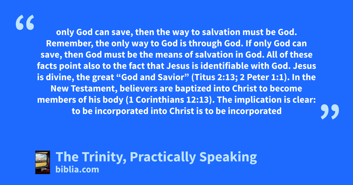 only God can save, then the way to salvation must be God. Remember, the only way to God is through God. If only God can save, then God must be the means of salvation in God. All of these facts point also to the fact that Jesus is identifiable with God. Jesus is divine, the great “God and Savior” (Titus 2:13; 2 Peter 1:1). In the New Testament, believers are baptized into Christ to become members of his body (1 Corinthians 12:13). The implication is clear: to be incorporated into Christ is to be incorporated