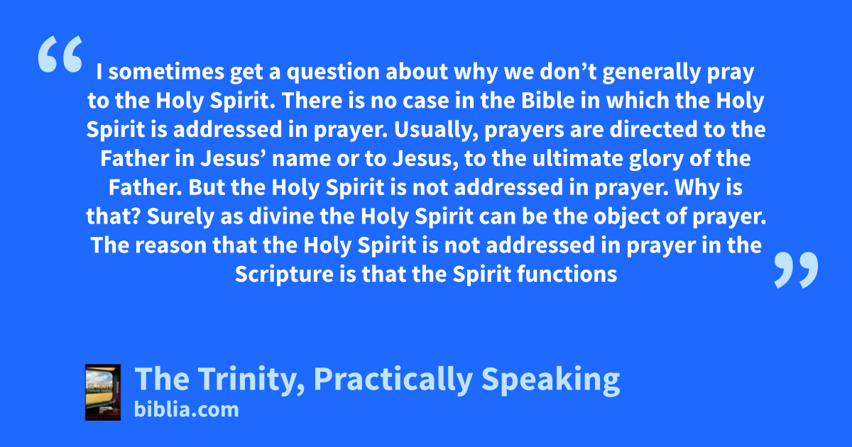 I sometimes get a question about why we don’t generally pray to the Holy Spirit. There is no case in the Bible in which the Holy Spirit is addressed in prayer. Usually, prayers are directed to the Father in Jesus’ name or to Jesus, to the ultimate glory of the Father. But the Holy Spirit is not addressed in prayer. Why is that? Surely as divine the Holy Spirit can be the object of prayer. The reason that the Holy Spirit is not addressed in prayer in the Scripture is that the Spirit functions