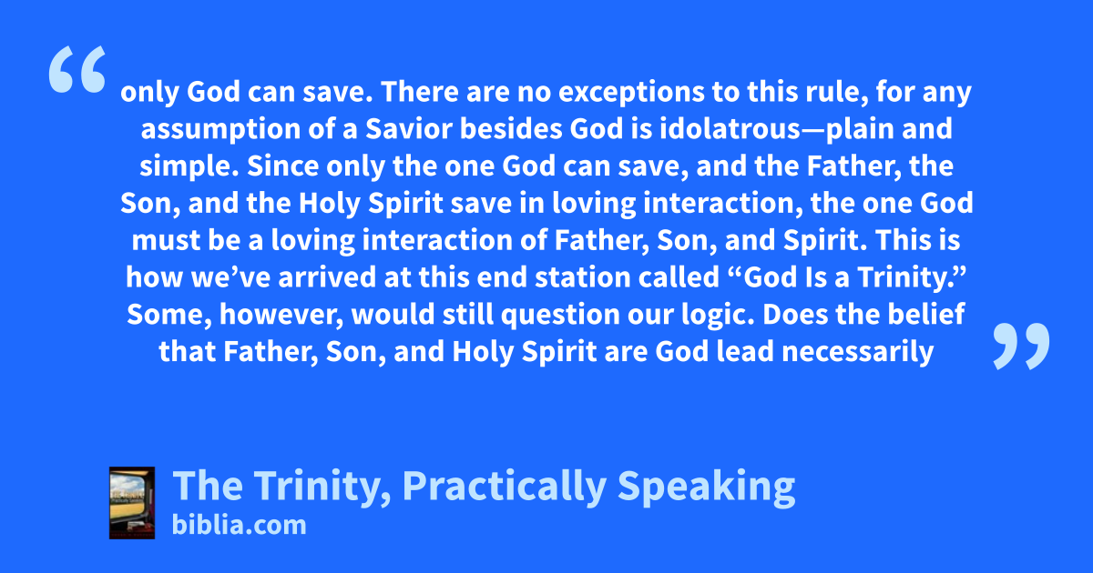 only God can save. There are no exceptions to this rule, for any assumption of a Savior besides God is idolatrous—plain and simple. Since only the one God can save, and the Father, the Son, and the Holy Spirit save in loving interaction, the one God must be a loving interaction of Father, Son, and Spirit. This is how we’ve arrived at this end station called “God Is a Trinity.” Some, however, would still question our logic. Does the belief that Father, Son, and Holy Spirit are God lead necessarily